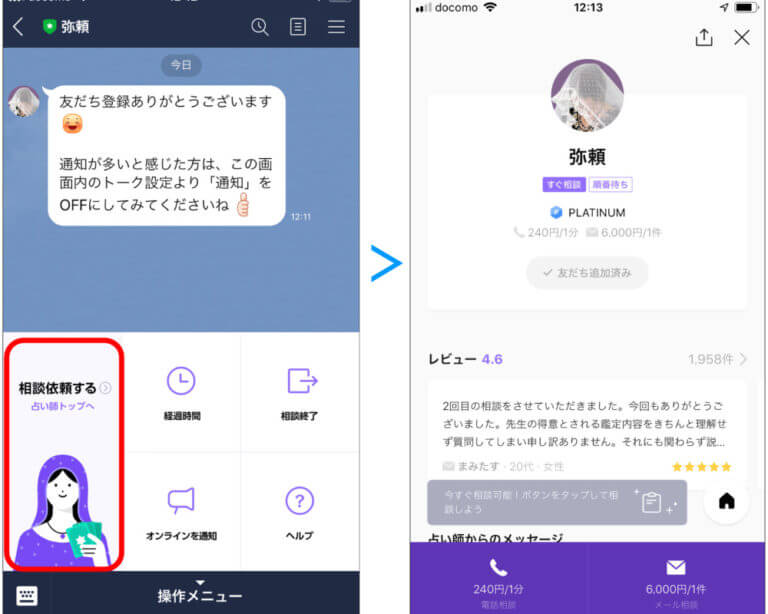 占い師を色々見ていく中で、気になった占い師は「友だち追加する」をタップして、お気に入り登録しておきましょう。