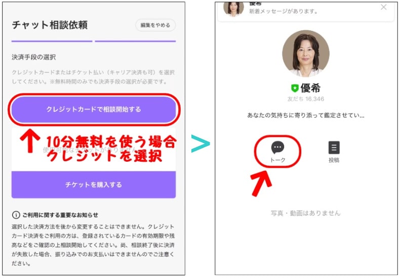 の2種あり、チケット購入は先払いなので、まず初回最大10分無料で占いを体験したいならクレジット決済を選ぶようにしてください。