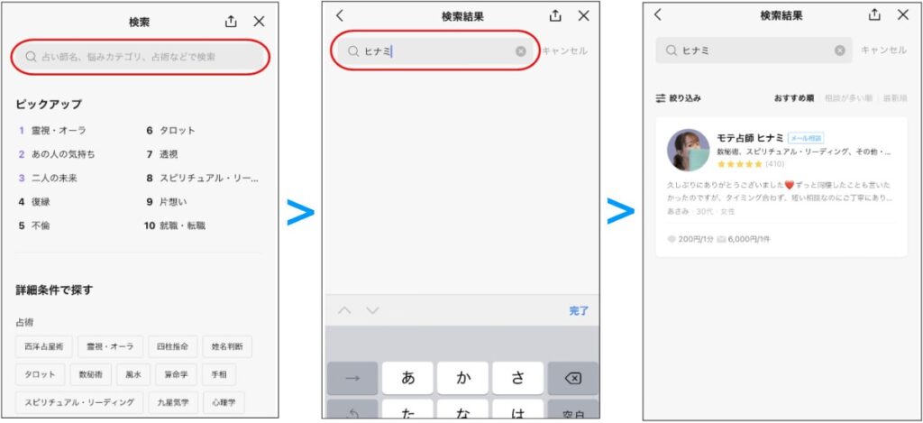 お目当ての占い師の名前や、悩み・占術など、キーワードを入れて絞り込むことが可能です。