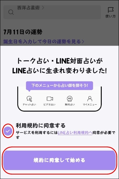 まずはLINE占いの利用規約を確認し、「利用規約に同意する」にチェックを入れ、「規約に同意して始める」をタップします。