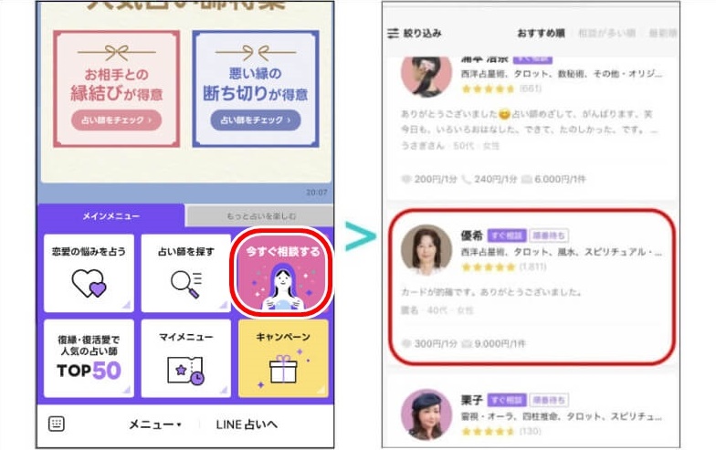 順番待ちの機能は、画像のように「順番待ち」と記載のある占い師のみ可能です。